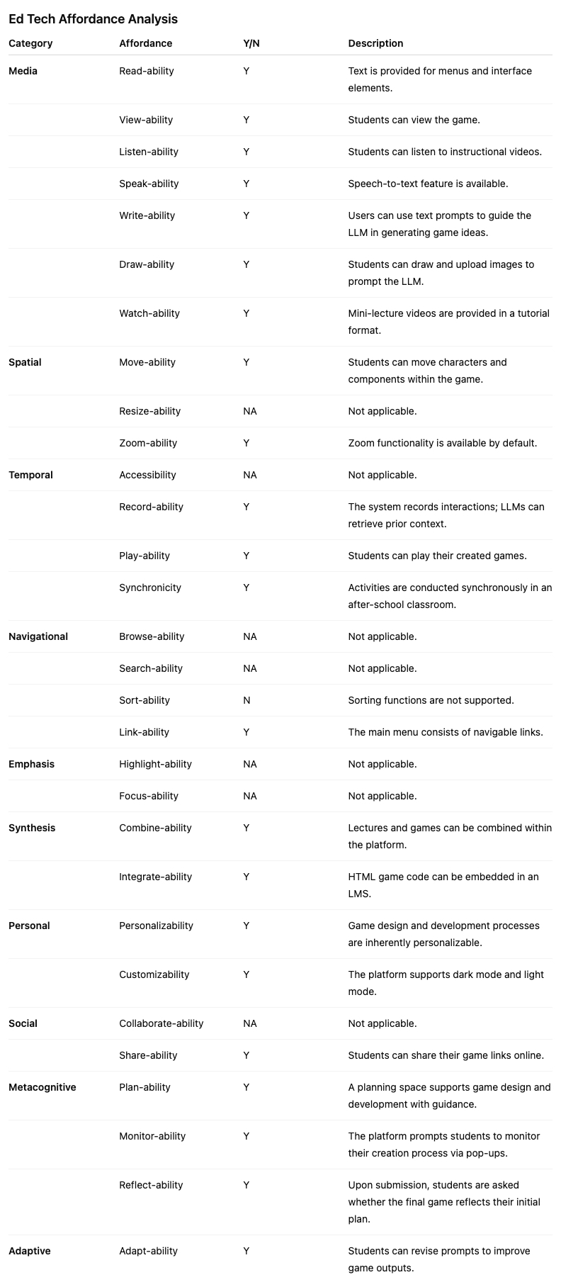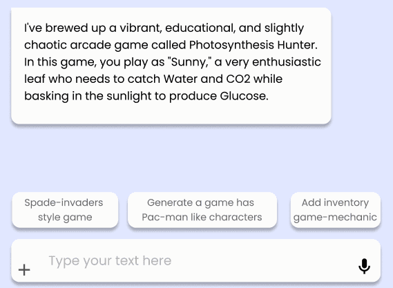 Built-in prompt templates scaffold inputs for planning and game creation, helping learners translate ideas into game mechanics.