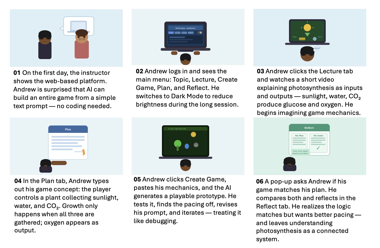 The storyboard illustrates Andrew’s end-to-end learning journey, showing how structured stages, AI support, and reflection help him translate scientific concepts into a playable game and deeper conceptual understanding.
