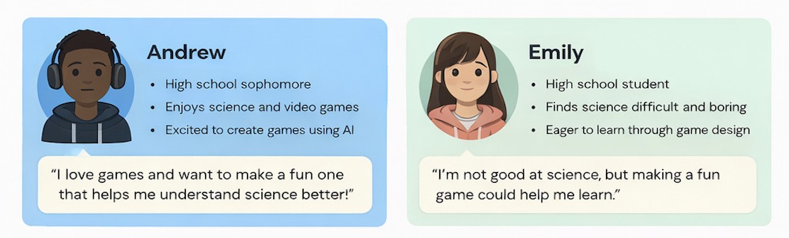 These personas represent two learners who engage with science through game creation, ranging from a student already motivated by games to another who struggles with traditional science instruction.